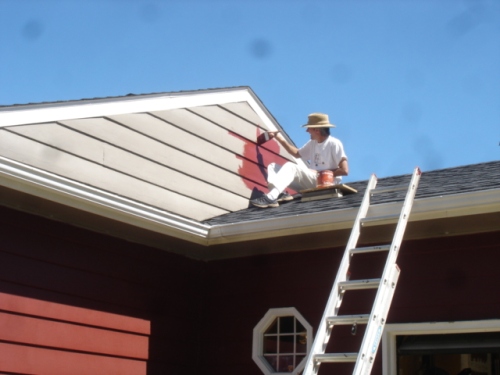 The most difficult part of the gable to paint was the part that was furthest back, because I had to sit on the garage roof to do it. Even though the weather was rather mild, those black asphalt shingles were hot as an iron skillet. I burned a couple inches off my butt while I sat there, painting as fast as I could. After the back corner was done I was pretty glad to be able to stand on the edge of the eaves with my back end to the breeze to paint the rest.