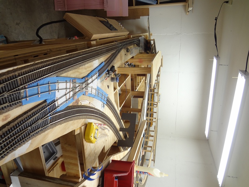 Assuming I can get the crossover working so that trains can run through it, they’ll eventually end up looping around the big curve in the background and up around the bend that turns toward the camera in the photo. When that happens, I’ll have to throw a party and invite you over to see it.