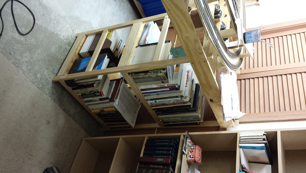 The Lost Continent Railway occupies a lot of real estate, most of it at chest level. I wanted to stand alongside the right of way instead of looking down at it. That left quite a lot of room underneath the bench that the layout’s built on, room that I had barely begun to make use of until this afternoon when I knocked together some shelves that would hold the couple hundred pounds of books I’ve collected. Until now, they’ve been gradually bowing the shelves of a chipboard book case that I desperately need to get out of the basement to give it a little more breathing space. The three-quarter inch plywood shelves in this corner of the layout holds all the books and has a little room left over. The shelves also do double-duty as a rock-solid anchor for the bench. Not bad for a couple hours’ work.