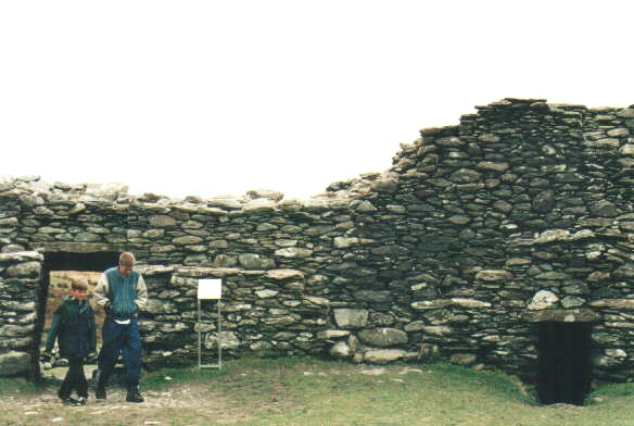 This fort really is rather impressive, by the way. Unlike the beehive huts, the walls of the fort are something like ten feet thick and twelve feet high, and the fort’s defenders could climb up the stairways built into the walls to fend off marauders by bonking them with rocks or whatever the cutting edge of weapons technology was at the time. The small door you see to the right of the boys is a storage chamber built into the wall. If you want to see the fort, by the way, you’ve got to REALLY WANT TO SEE IT, because it’s at the end of a long, long one-lane sunken road that winds up a valley choked with sheep, which frequently step out onto the road to greet tourists in the friendly manner that all Irish sheep seem to have. And it’s on the south coast of the Iveragh Penninsula, on the Ring of Kerry — sorry, I jumped ahead without telling you.