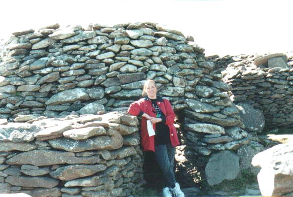 Here’s Barb at the beehive huts, near Slea Head. These are supposed to be something like a thousand years old, constructed by hermits or religious devotees or somebody else who wanted to be very, very alone, didn’t care much where he lived and didn’t have a lot to build with. There are lots of flat stones lying all over the ground in Dingle, so these guys piled them up in a circle, like an igloo. Why these are called ‘beehive huts’ and not ‘stone igloos’ is beyond me, but I’m not on the tourist board, so it’s not my call. If you ask me, they look suspiciously like somebody rebuilt them a year or two ago, and it might just possibly have been the local farmer who charges a pound per sight-seeing tourist, or they might actually be a thousand years old and just look as though they’re remarkably clean and well-kept, especially for ruins that thousands of tourists tramp through every week.