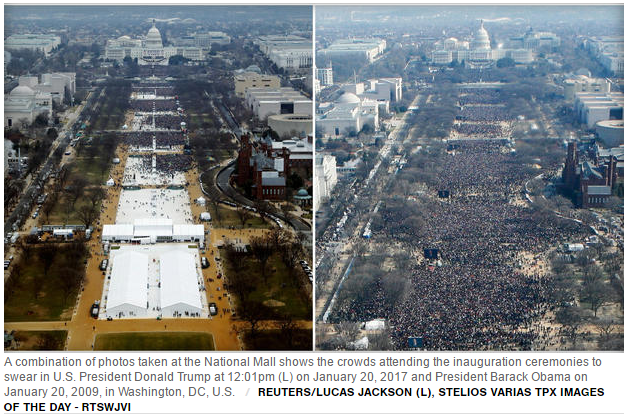 “In a Saturday phone call, Trump personally ordered [acting National Park Service director Michael T.] Reynolds to produce additional photographs of the previous day’s crowds on the Mall … The president believed that the photos might prove that the media had lied in reporting that attendance had been no better than average. Trump also expressed anger over a retweet sent from the agency’s account, in which side-by-side photographs showed far fewer people at his swearing-in than had shown up to see Barack Obama’s inauguration in 2009.” The Washington Post, 26 January 2017