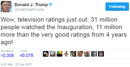 Wow, television ratings just out: 31 million people watched the inauguration, 11 million more than very good ratings from 4 years ago!