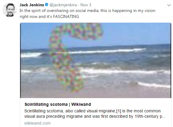 It’s also somewhat more satisfying to have a real name for this phenomenon, instead of “migraine aura,” even if all it means in plain English is “shimmering blind spot.”