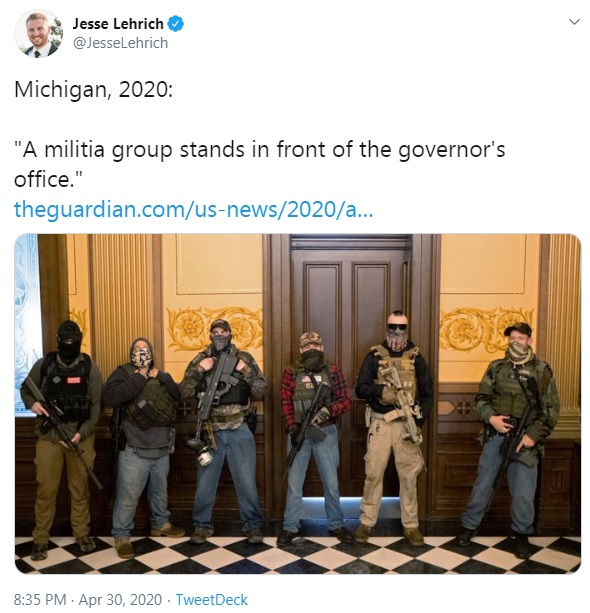 “Armed protesters demonstrate against Covid-19 lockdown at Michigan capitol,” Lois Beckett writing in The Guardian, 4/30/2020