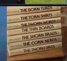 The stack gets a little higher in the next scene with an all-anagram stack of “The Thorn Birds,” including: