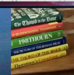 And finally, the stack turns into a random pile of books we’ve seen in previous episodes, including: