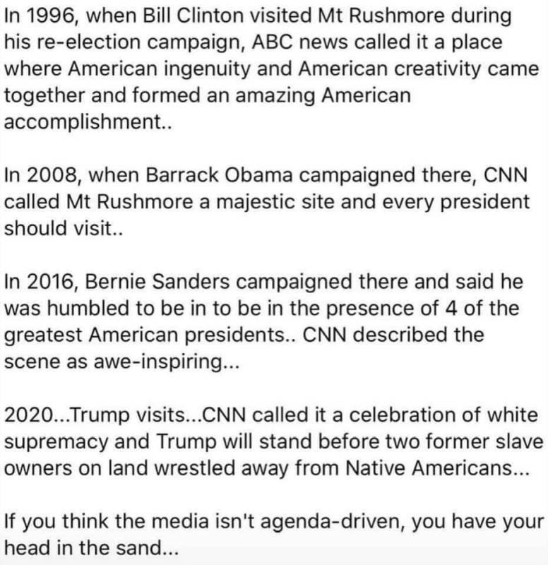 There aren’t any citations in the meme, but the only CNN story I could find that used the phrases “white supremacy” and “former slave owners” when describing Trump’s July 4 speech quoted Nick Tilsen, a citizen of Oglala Lakota nation and founder, CEO and president of the NDN Collective, a nonprofit organization supporting Indigenous people, so it really wasn’t CNN saying those things, it was Tilsen. Not that I think it matters. It’s factual. CNN was reporting the facts. That’s not an agenda, that’s journalism.