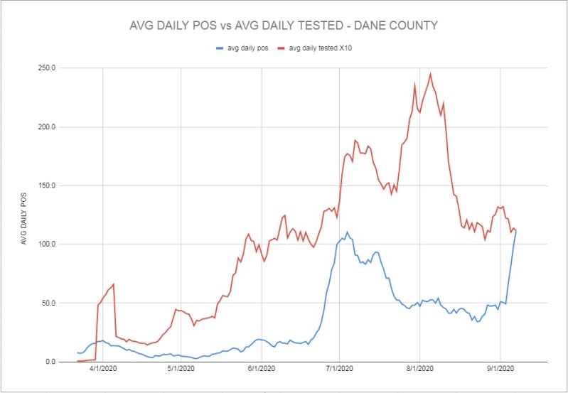 So much for the theory that if you don’t test as much, you don’t get so many new cases. New cases per day in Dane County and in Wisconsin take a massive jump while testing remains flat or decreases.