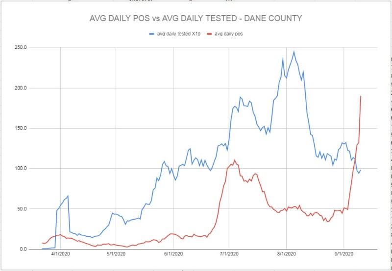 DHS reported 1,547 positives cases in Wisconsin today. Almost one-third of those (482) were in Dane County, and 395 of the Dane County positives came from the UW-Madison. Open the university, Tommy Thompson said. Great idea, Tommy. Nice going. Good job.