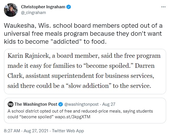 It’s not that they said something cold-hearted, like, “It’s a cost-saving measure. If we cut free meals, we not only save the cost of purchasing the meals, we also save the cost of employing the people serving the meals, and we can use the cafeteria space for other activities.” That would have been merely cold-hearted.
