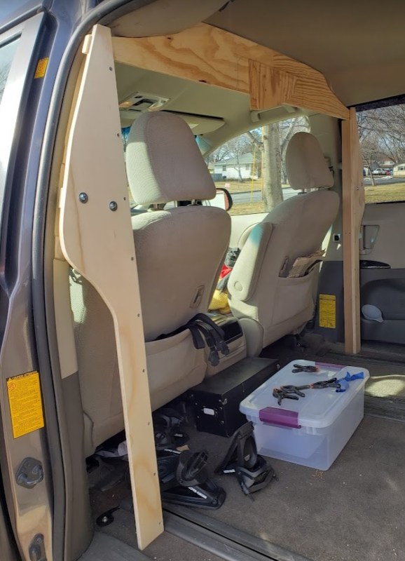 In between my morning and afternoon walkies I worked on the camping thing some more. It felt so good to get outside and work on it for more than five minute without losing sensation in my hands. It’s not quite warm enough to brush some poly on the finished pieces, so instead I figured out how to set up the arch across the front of the van between the driver’s cabin and the rear compartment. The goal is not to wall off the back from the front, just to give me something to hang a curtain from. In the original design it’s a combination curtain rod and coat rack, festooned all over with coat hooks, and it even has overhead lights. I’ll definitely do the coat hooks. We’ll see about the lights.