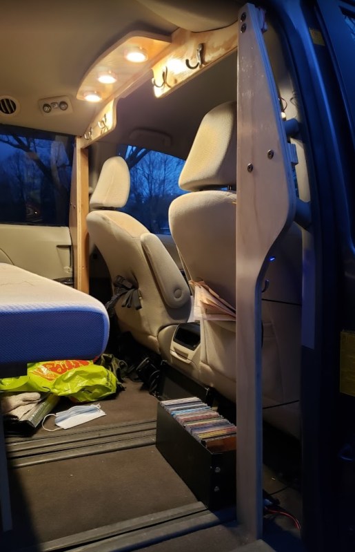 They are not lit in this photo because obviously they were not installed in the van which means the wires weren’t connected to a live circuit. They’re installed now, but I didn’t take a photo of them with the lights switched on because I forgot, and I’m not going back out now. Each light is at the end of a foot-long gooseneck and is dimmable, which will be very nice for reading a chapter or two before lights out. And there’s a USB port in the base of each light for recharging phones or whatever. I can’t wait to try them out.