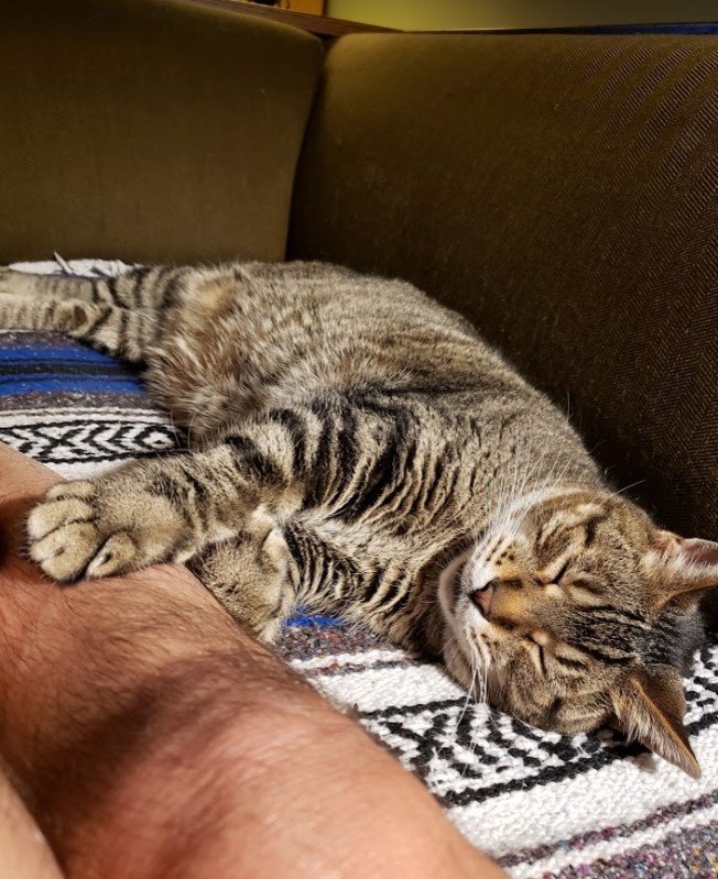 My cat is not what you would call neurotypical. He will abide physical contact only in very particular ways. Sitting in my lap is out of the question. This is what he considers “cuddly.”