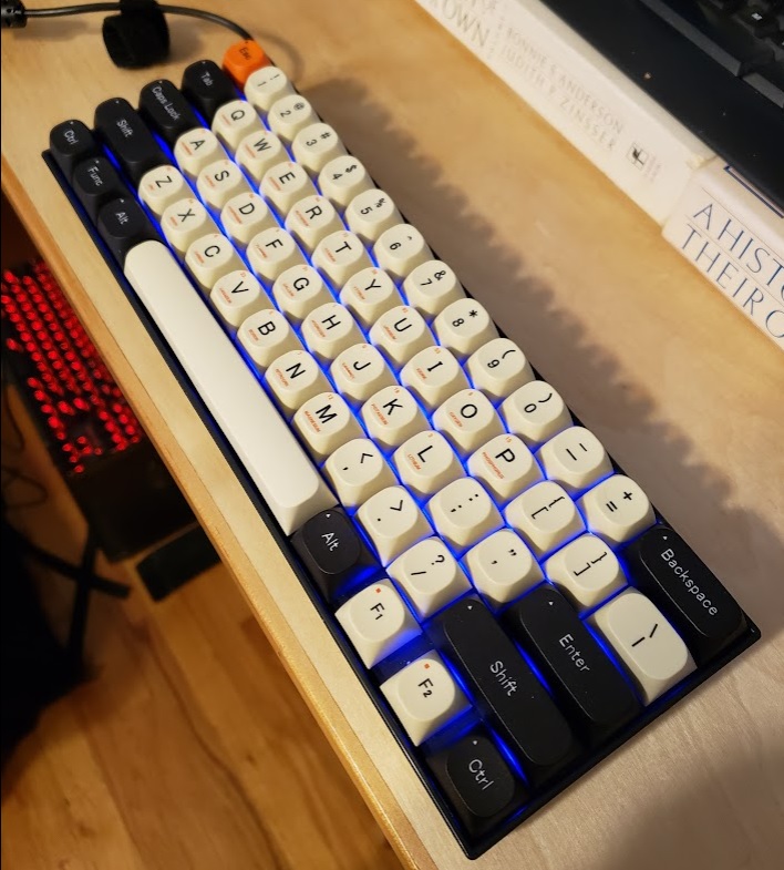 It’s all here now and it’s all put together and I’m happy to say it’s a lot more fun to type on than I thought it would be. The key action is very smooth and much more quiet than the keyboard I was using, which was very clicky-clacky. The new one is also a lot better-looking! The old keyboard was flat black with shiny red lights under the key caps. The main key caps on the new keyboard are desert brown and the supporting keys (shift, tab, backspace) have chocolate brown key caps. There’s also a soft backlight under the key caps; I can change the color of it and I’ve settled on a cool blue. I wasn’t sure I’d care about the appearance of the keyboard but it turns out I do.