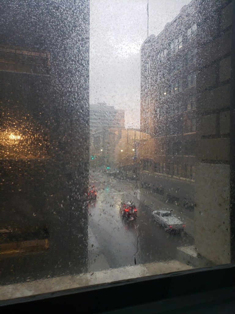 I came out of the bathroom to find B sitting in the dark. “Why’s it so dark?” I asked, just before I noticed the rain pouring down and heard thunder booming overhead.