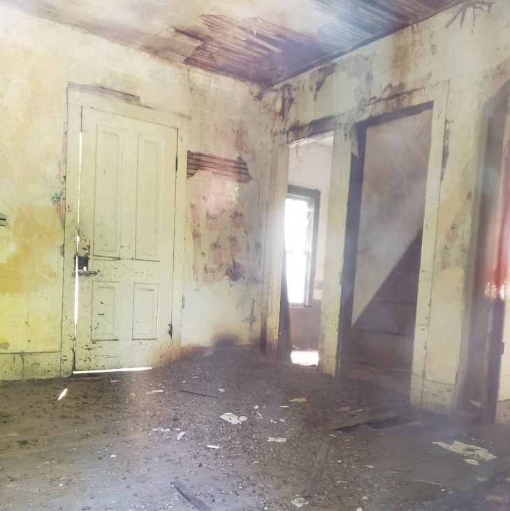 Most of the interiors are badly damaged by water or, in the house shown above, by varmints stashing their winter stores in the ceiling. It looks to me like the nuts, or whatever that is spread out on the floor, got soaked with water leaking in through the roof, which speeded up the rot of the plaster and lath until it broke through and spilled onto the floor. Looks to me like the floorboards are nearly rotted out too. And check out how steep that stairway is!