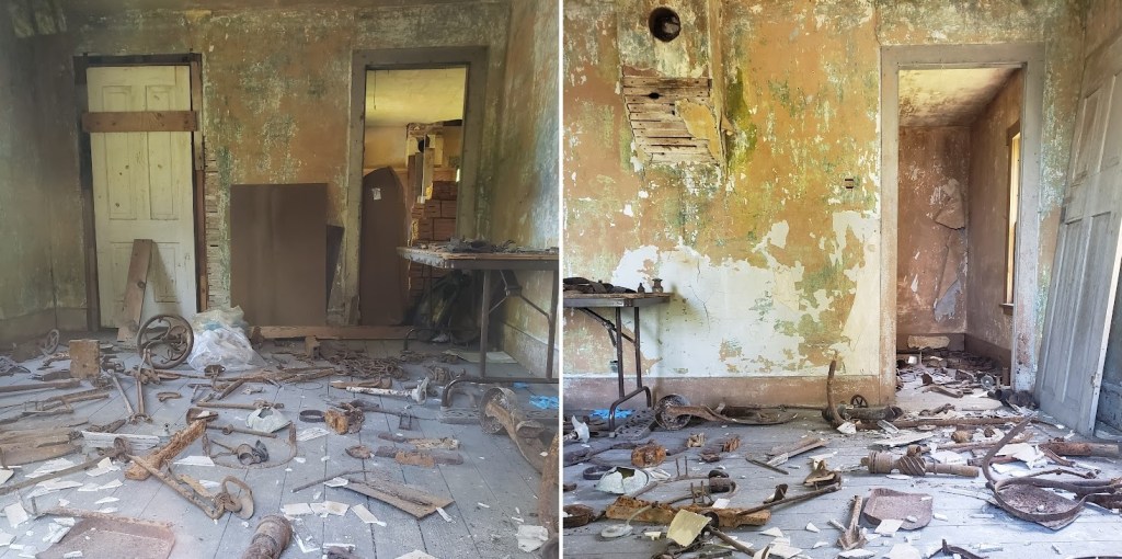Another house was being used to store a wide variety of found objects, spread out on the floor for easy identification, not that I can tell what most of them are. I can see a dust pan and what looks like half of a pair of ice tongs, but most of it looks like scrap iron to me.