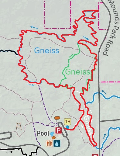 After walking down from the trail head, I turned south along a path used by skiers and after about ten minutes came to an intersection with the white loop of the Gneiss trails. I walked north up the outside of the white loop, then up the outside of the green loop before joining the blue loop. These were not at all like the wide, flat hiking trails at Blue Mounds. Mountain bikers want lots of hairpin turns, it seems, and if the trail must go straight, then there has to be a steep ramp or a sharp drop-off somewhere along the way. I was very glad to be wearing snow shoes, so I could walk these slippery ups and downs and round-and-rounds without having to worry about my feet slipping out from under me and face-planting over and over.
