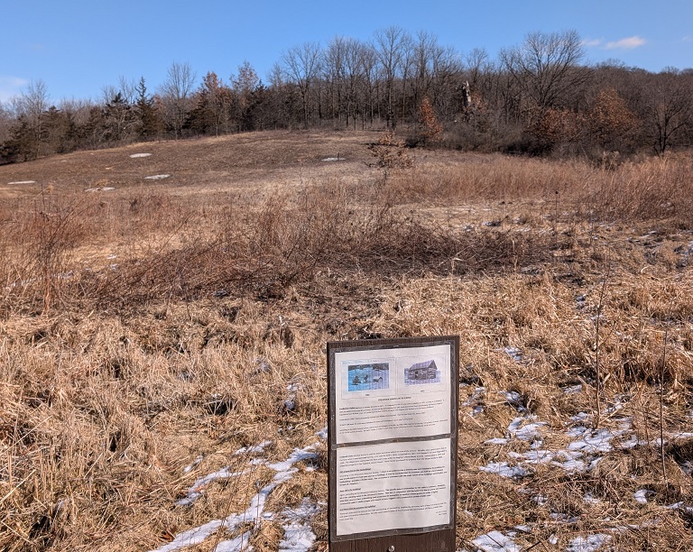 I parked my car in the lot on Stagecoach Road, bundled up and got ready to start hiking toward the village. The Mammoth’s Back Preserve appeared to be an open field, with an oddly artificial-looking hill about fifty to seventy-five feet tall standing on the southern edge of the field. The trail skirted around the base of the hill to the east. From the parking lot, I couldn’t see beyond it. It wasn’t until after I bundled up and started hiking that I could see, on the other side of the hill, it was a bare corn field that stretched on forever. Well, a mile, at least. Standing in the middle of a flat cornfield with the wind whipping my face, my enthusiasm for completing this section of the trail dropped to zero. I turned tail and headed back to the van.